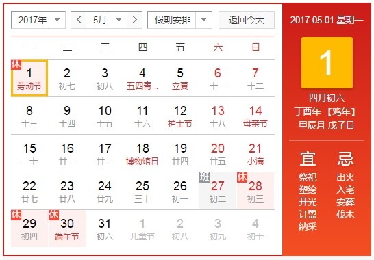 2017年五一勞動節放假安排:2017年4月29日(星期六) 、4月30日(星期日)、5月1日(星期一) ,共休3天